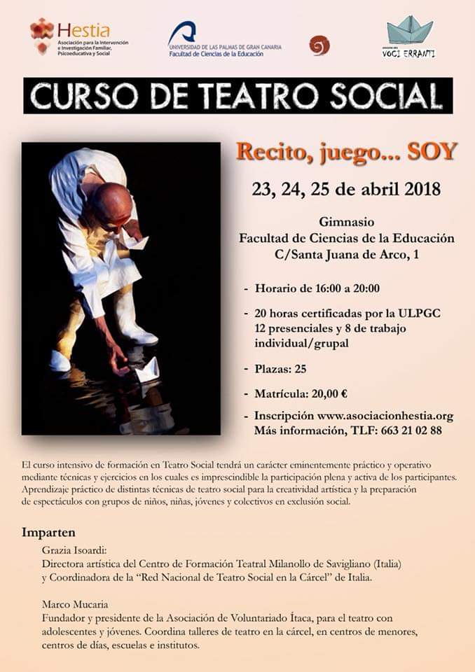 Nella primavera del 2018 l’amico Graziano Pellegrino, coordinatore dei Progetti Educativi dell’Associazione Hestia di Las Palmas e di Tenerife,  ci propone una collaborazione nell’ambito della Formazione in Teatro Sociale . Una proposta molto interessante in un territorio altamente motivato ed accogliente.
